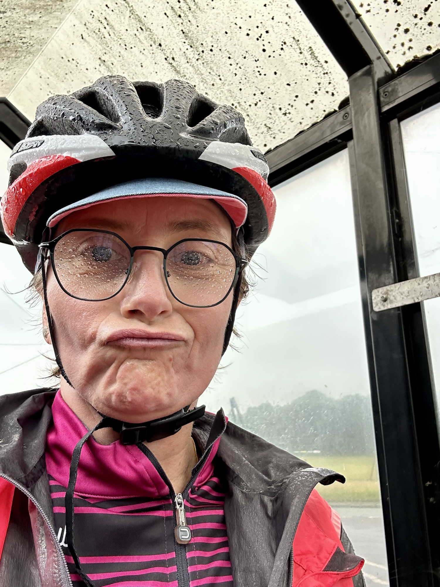 Départ donc sous une petite pluie rafraichissante qui finit par s’intensifier. Je m’abrite sous un abribus à 2 km du départ, puis repars, puis me réabrite sous l’abribus suivant à 2, 5 km du départ. La journée va être longue à ce rythme là…