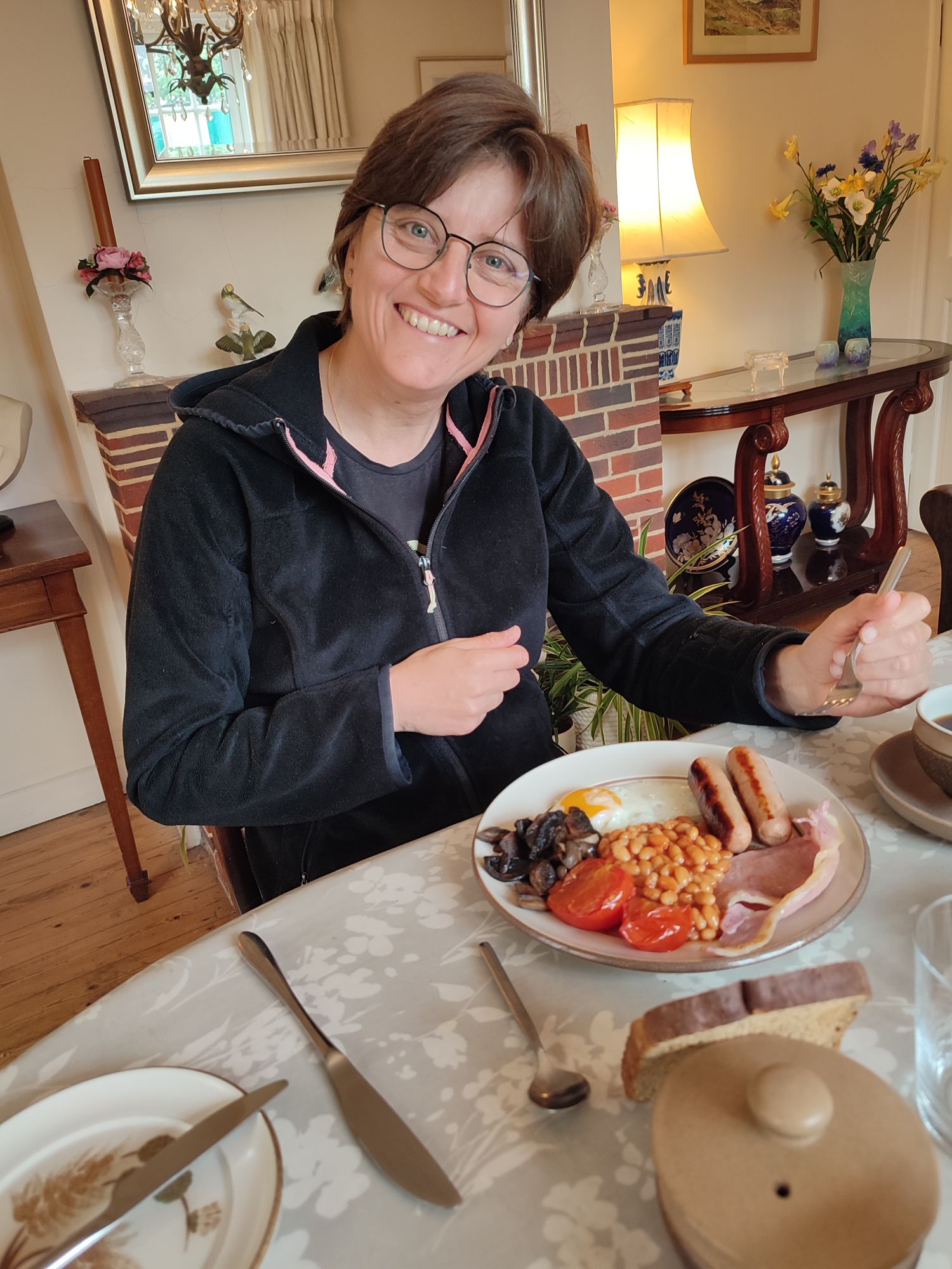 Enfin un vrai temps anglais ! Ce matin, la pluie tombe bien au réveil… Mais heureusement nous commençons la journée avec un véritable english breakfast que nous a préparé June ! C’était très bon ! Nous déjeunons en compagnie de Barry, un cycliste écossais qui vit au Sud de Poitiers. Il arrive de Inverness en Ecosse et il a roulé 13 jours. Il nous dit qu’il n’y a pas de mauvais temps, seulement de mauvais vêtements 🙂 !!!