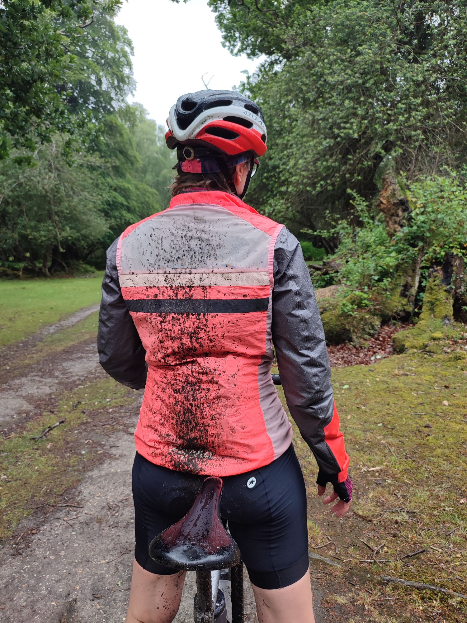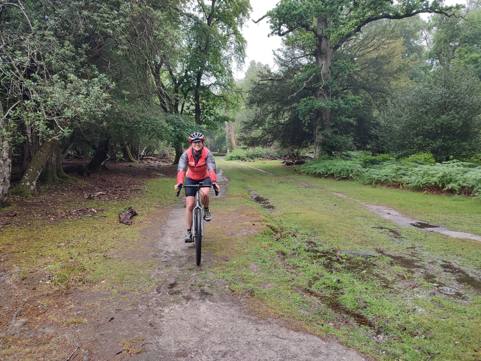 Dès que j’arrive dans la forêt, je suis trempée de rouler sur le sol mouillé qui m’éclabousse. Mes chaussures gore tex toutes neuves sont rapidement remplies par le haut via mes chaussettes. Bref, au bout de 10 min je suis trempée de la tête aux pieds et j’arrête d’éviter les flaques.