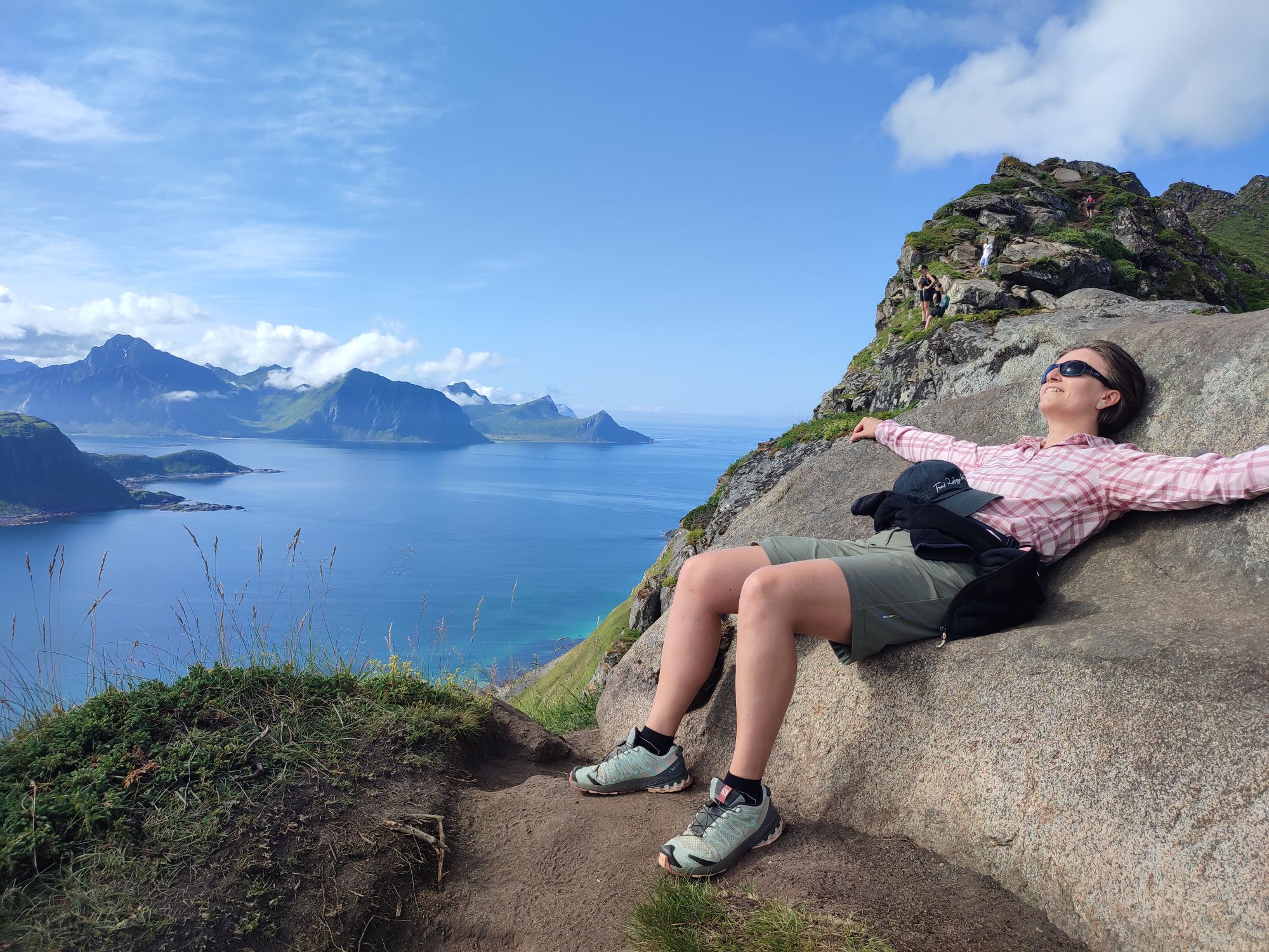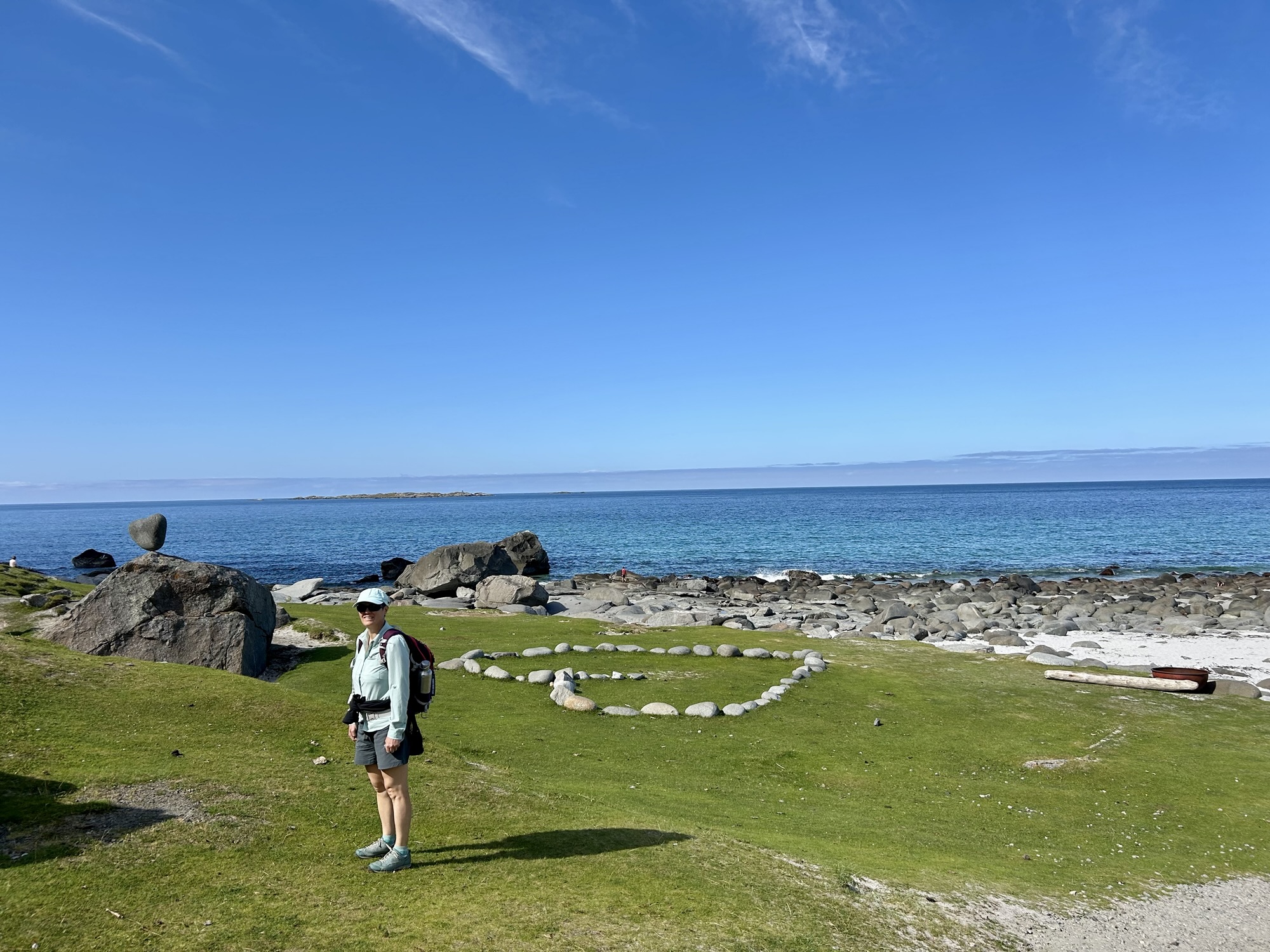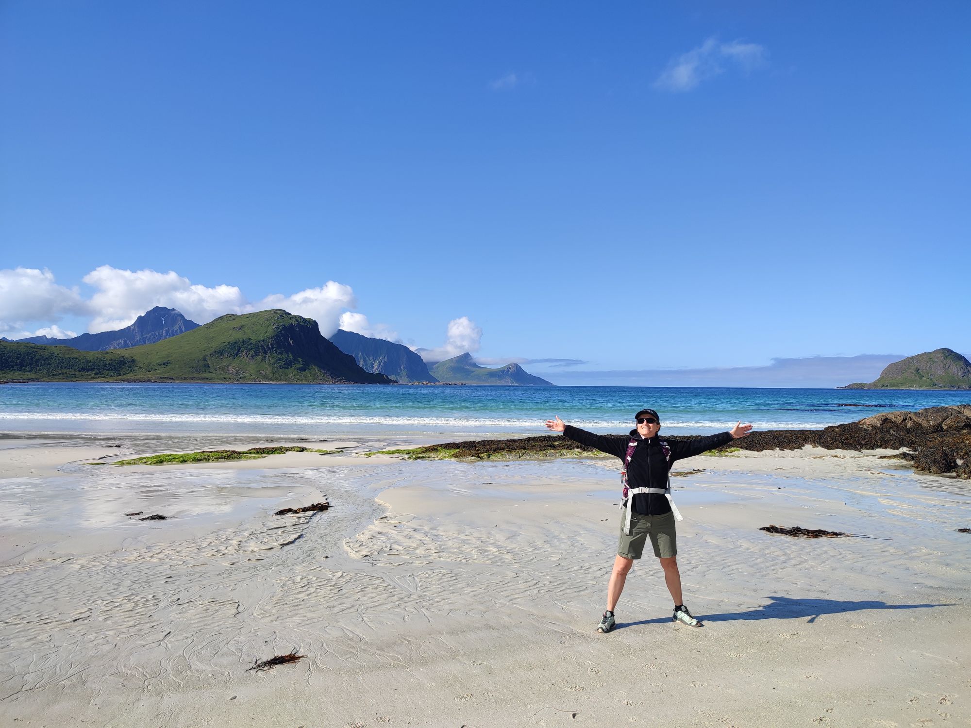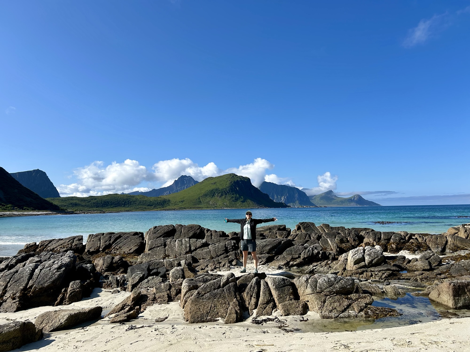 Après une bonne nuit de repos, nous décidons de partir pour une première randonnée dans les Lofoten. Le soleil est toujours au rendez-vous – 2 gourdes, un sac à dos avec de quoi se couvrir au cas où et nous voilà parties pour les plages de Vik et de Haukland.