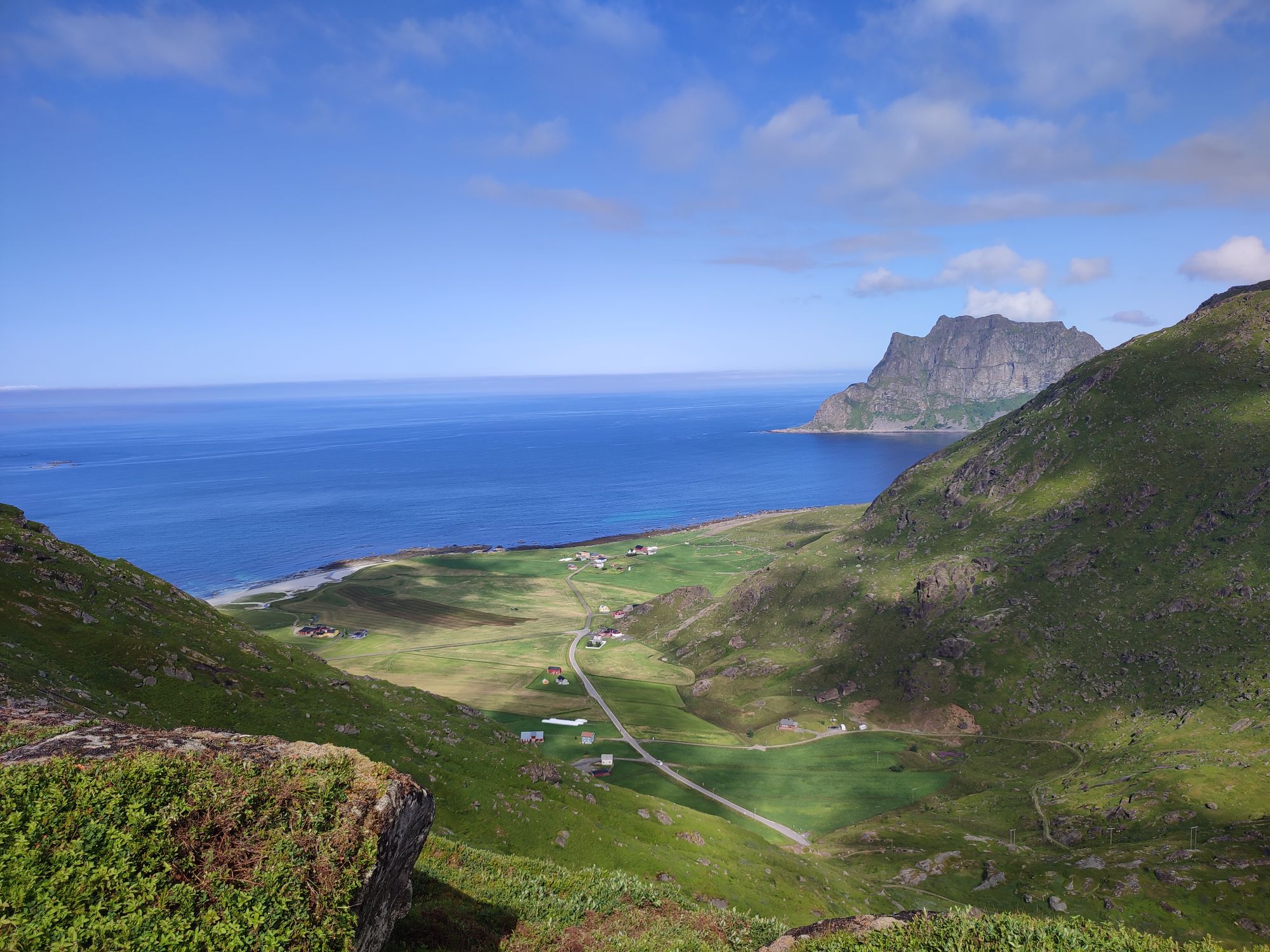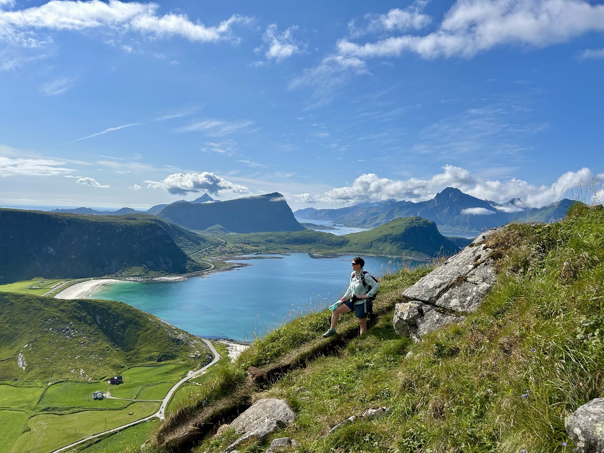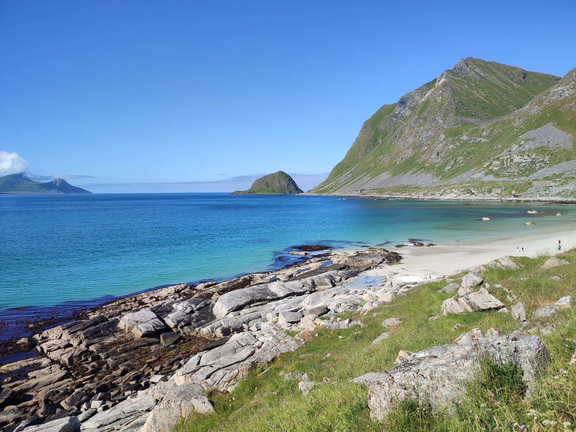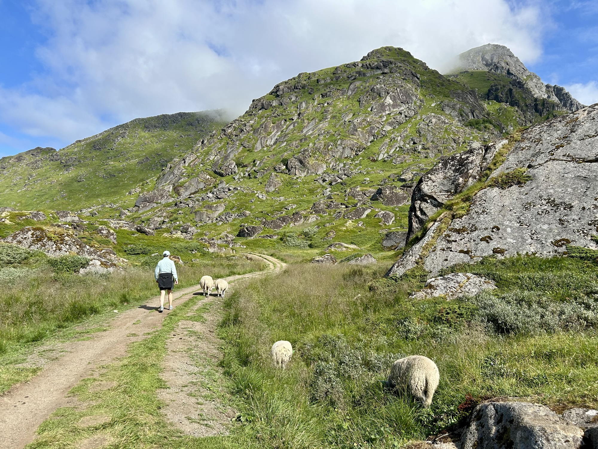 Nous traversons la plage de Vik, déserte, la mer est bleu turquoise et donne envie de se baigner ! Je propose à Carole de nous tremper quand nous reviendrons ! Nous rejoignons la plage de Haukland, tout aussi belle puis grimpons en direction du sommet Mannen. Au fur et à mesure que nous prenons de l’altitude, les paysages évoluent mais nous ne cessons d’admirer les magnifiques couleurs qui s’offrent à nous… Le sentier est assez prisé des touristes et des moutons.