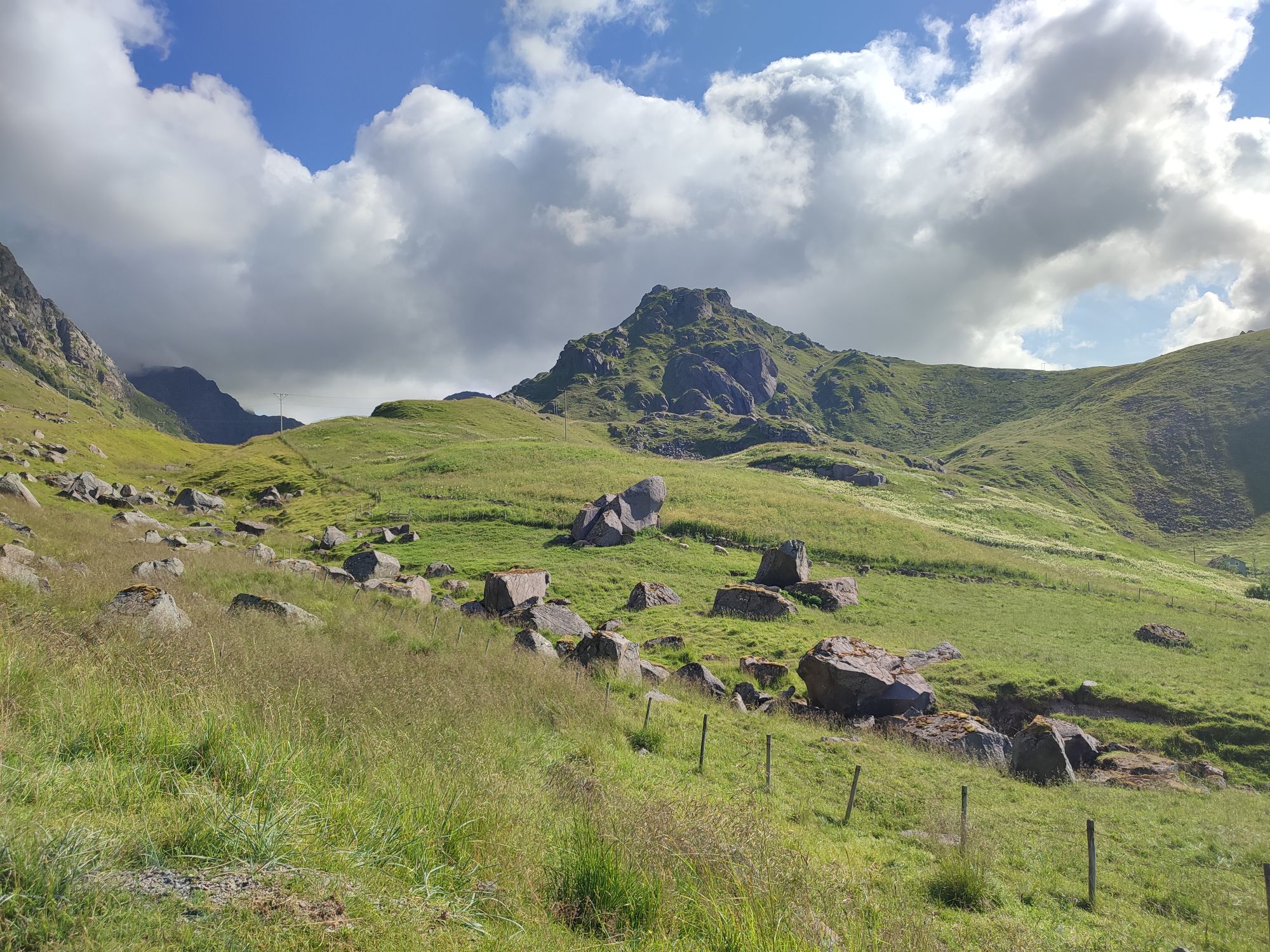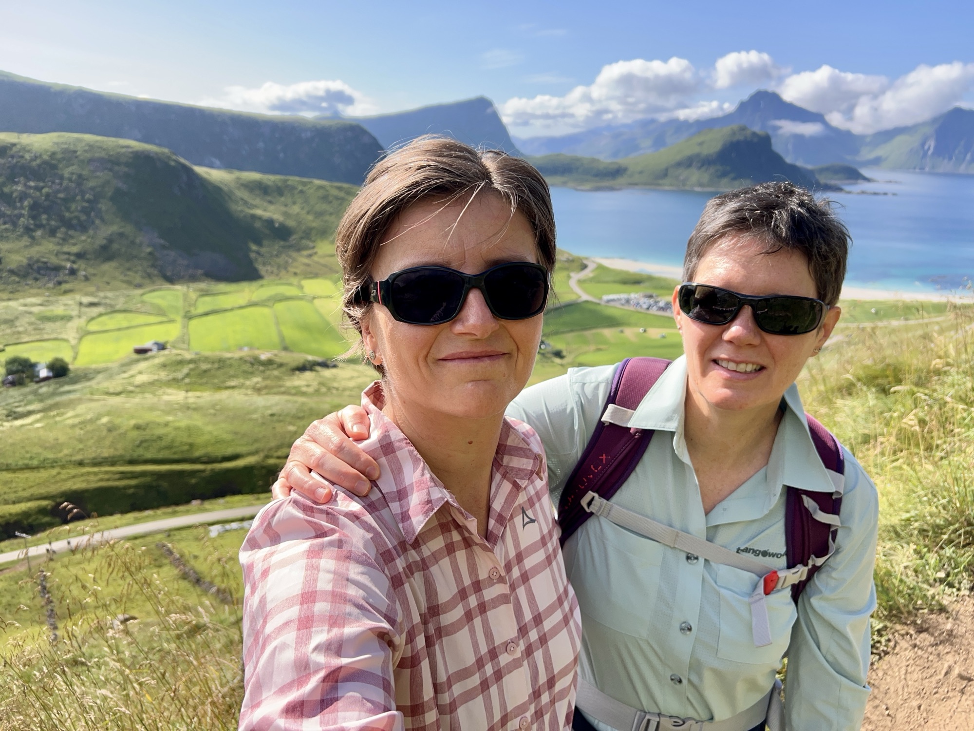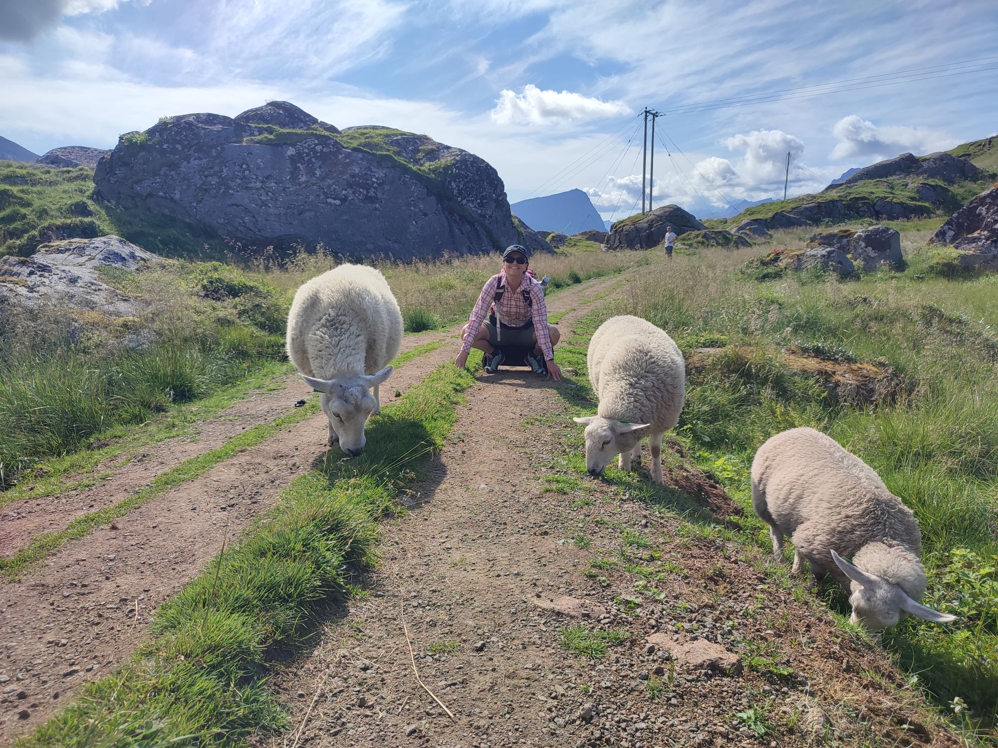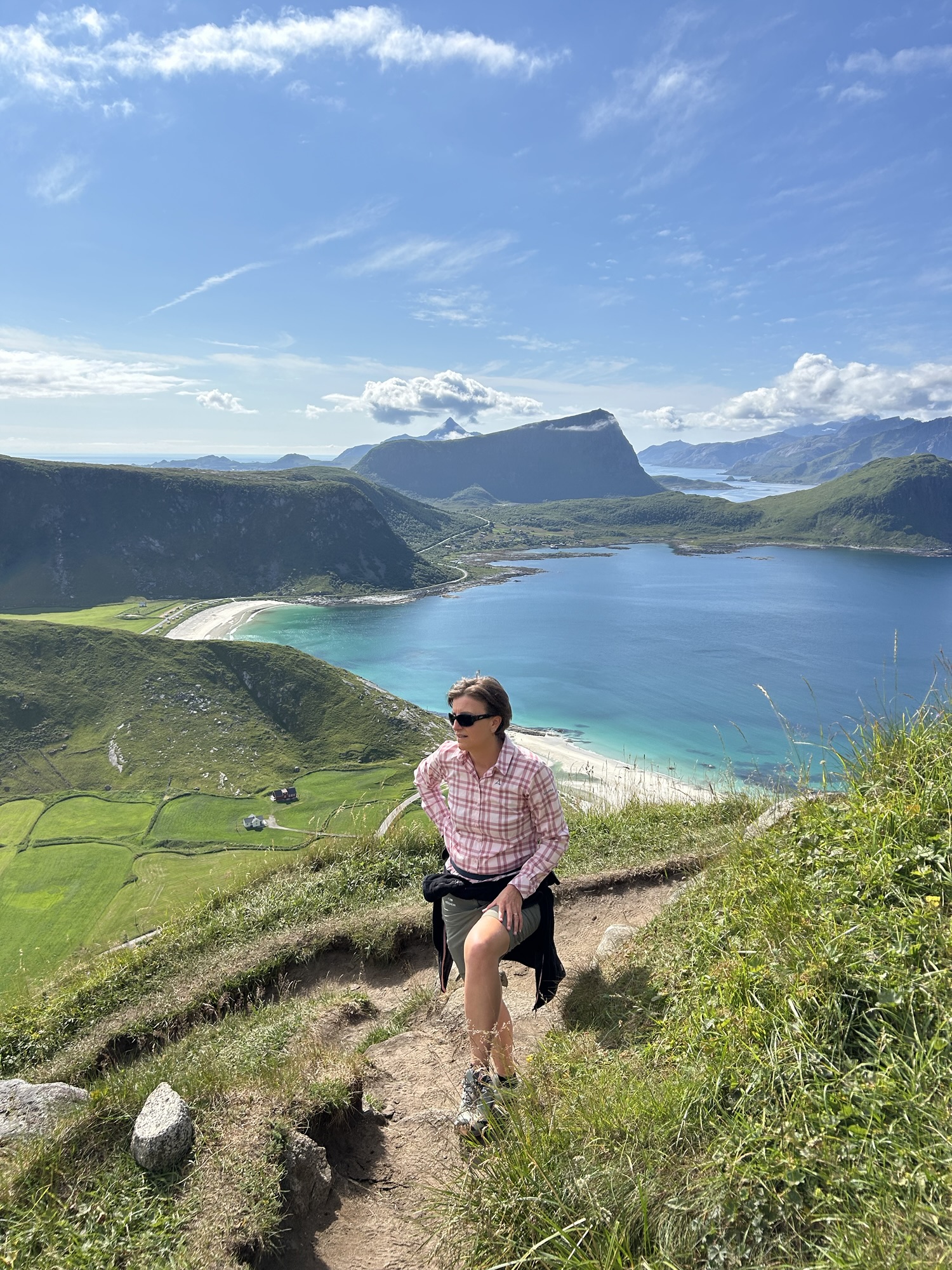 Nous traversons la plage de Vik, déserte, la mer est bleu turquoise et donne envie de se baigner ! Je propose à Carole de nous tremper quand nous reviendrons ! Nous rejoignons la plage de Haukland, tout aussi belle puis grimpons en direction du sommet Mannen. Au fur et à mesure que nous prenons de l’altitude, les paysages évoluent mais nous ne cessons d’admirer les magnifiques couleurs qui s’offrent à nous… Le sentier est assez prisé des touristes et des moutons.
