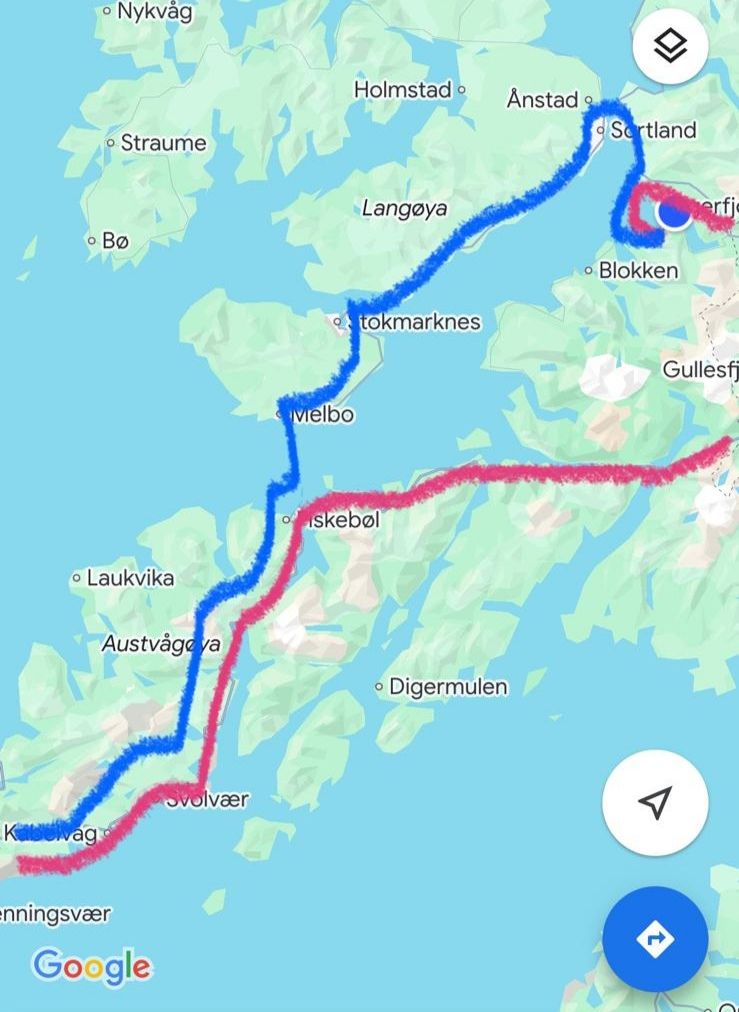 Nous avons finalement opté pour le tracé bleu et avons pris le ferry à Fiskebol pour atteindre Melbu.