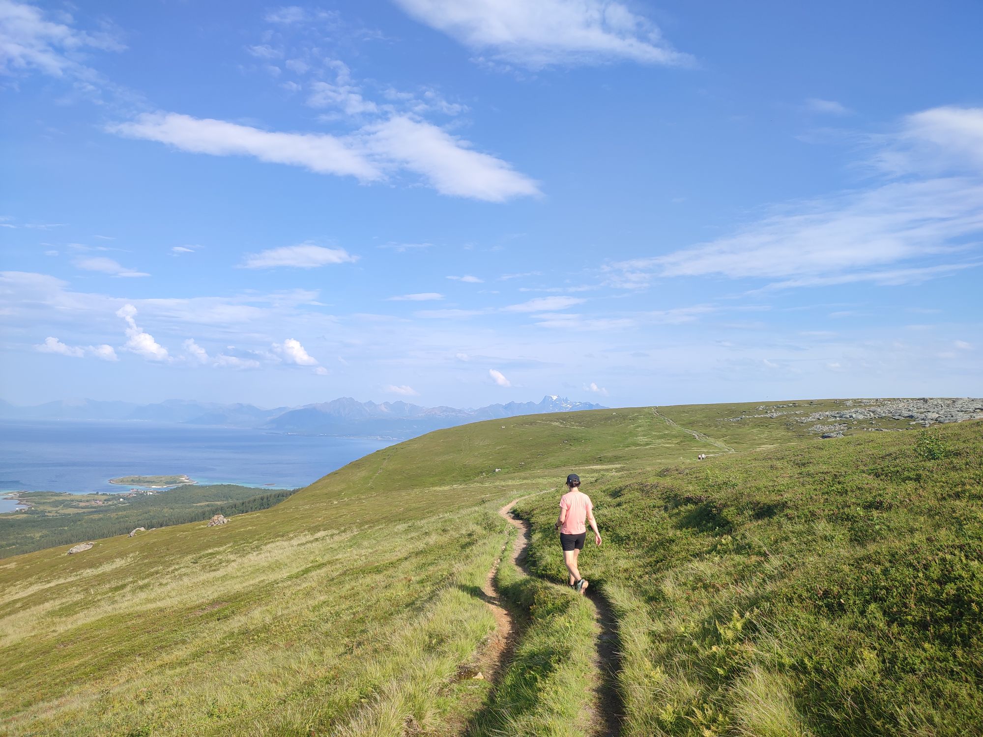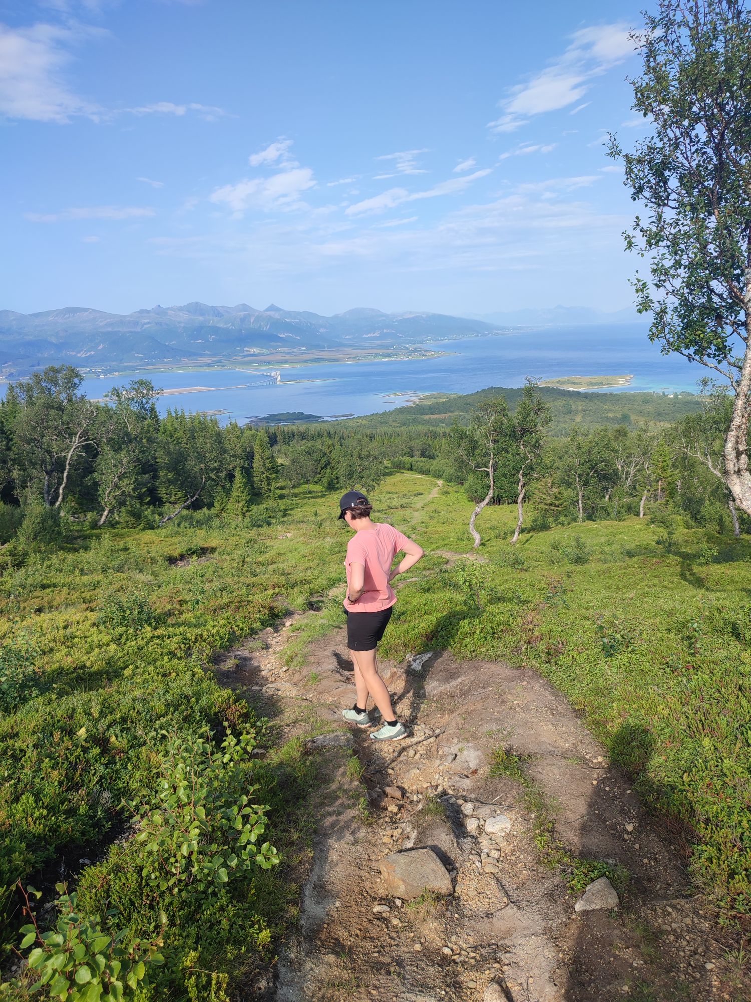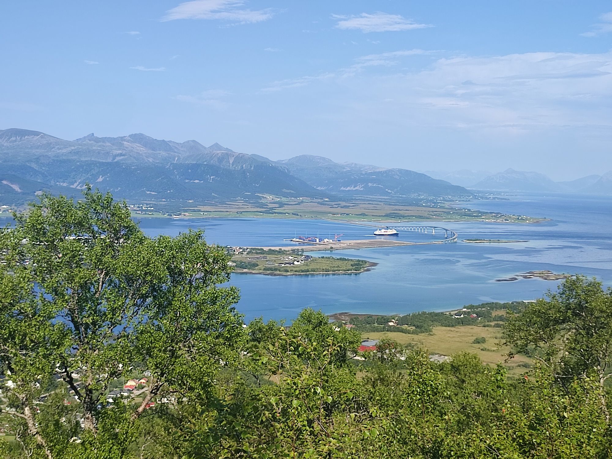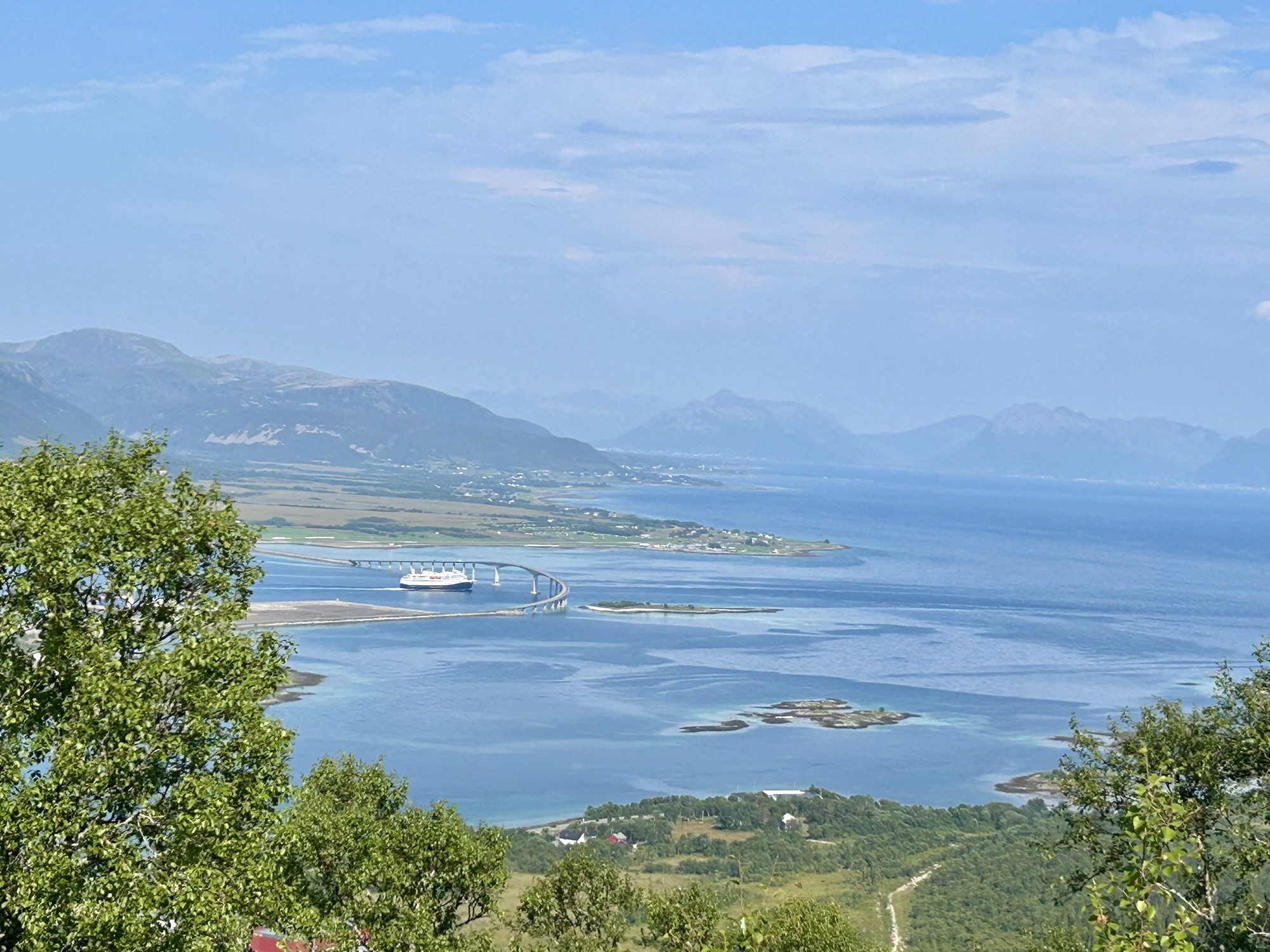 La montée est très raide et s’apparente plus à de l’escalade par endroit. Nous restons un long moment au sommet couvert de landes, à admirer le paysage et à voir passer l’Hurtigruten sous le pont en arc de cercle qui semble avoir été conçu pour laisser passer ce navire entre les 2 piles les plus hautes.