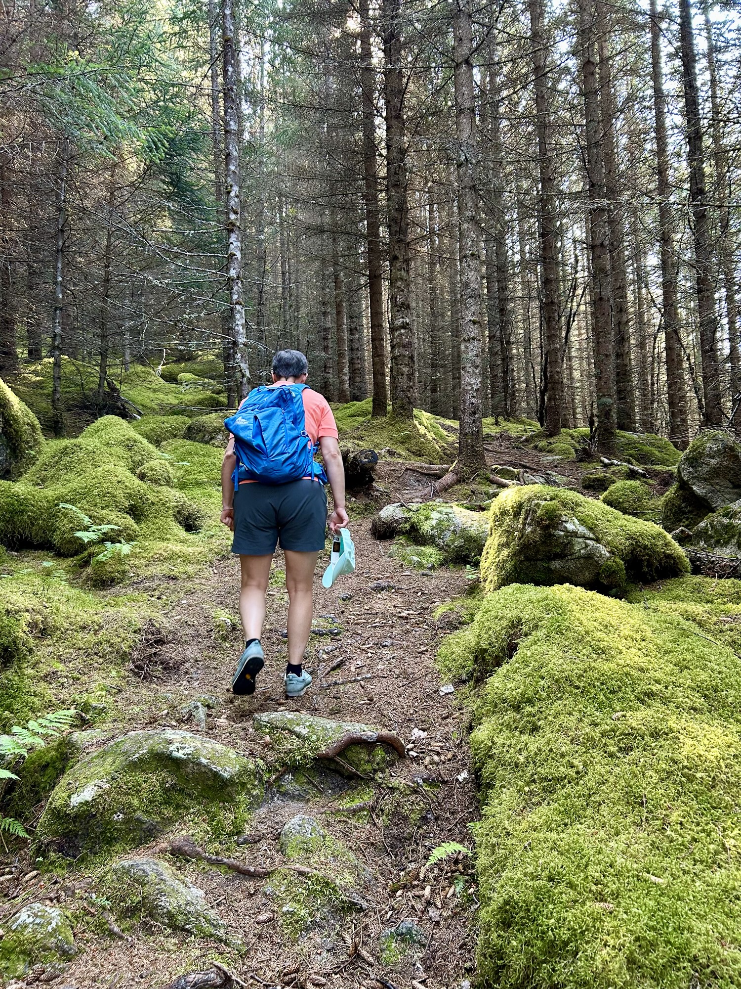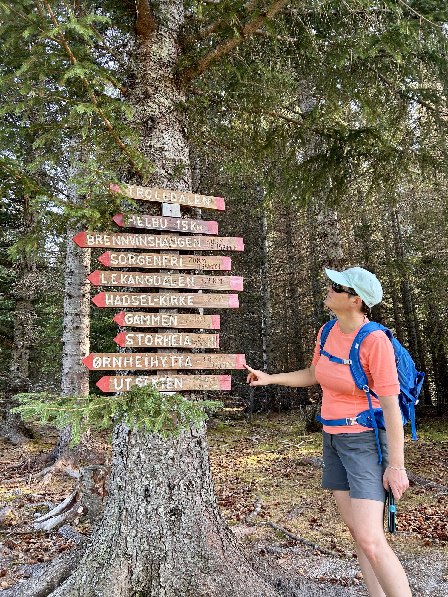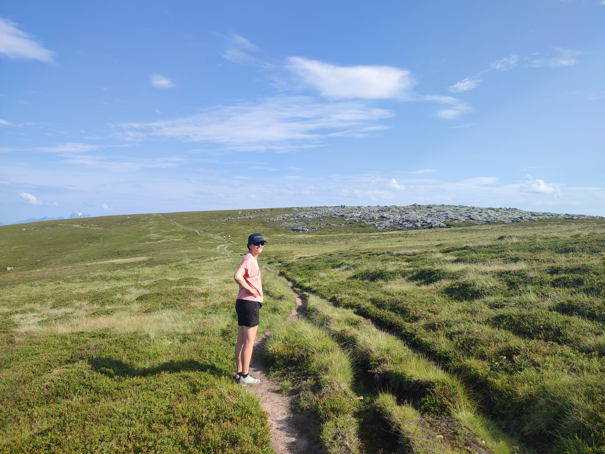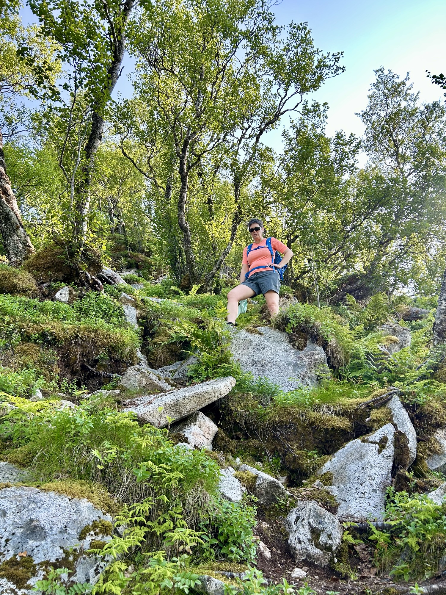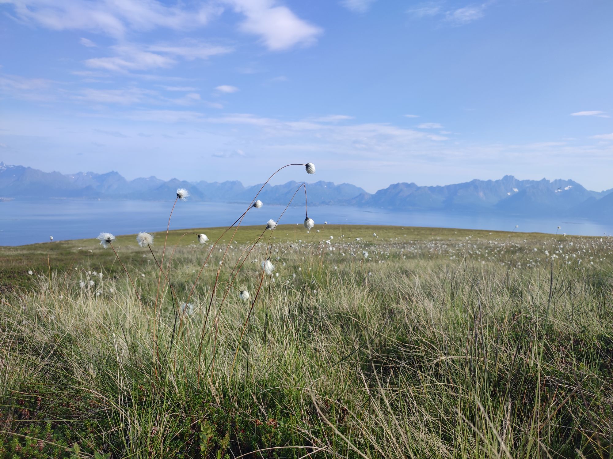 La montée est très raide et s’apparente plus à de l’escalade par endroit. Nous restons un long moment au sommet couvert de landes, à admirer le paysage et à voir passer l’Hurtigruten sous le pont en arc de cercle qui semble avoir été conçu pour laisser passer ce navire entre les 2 piles les plus hautes.