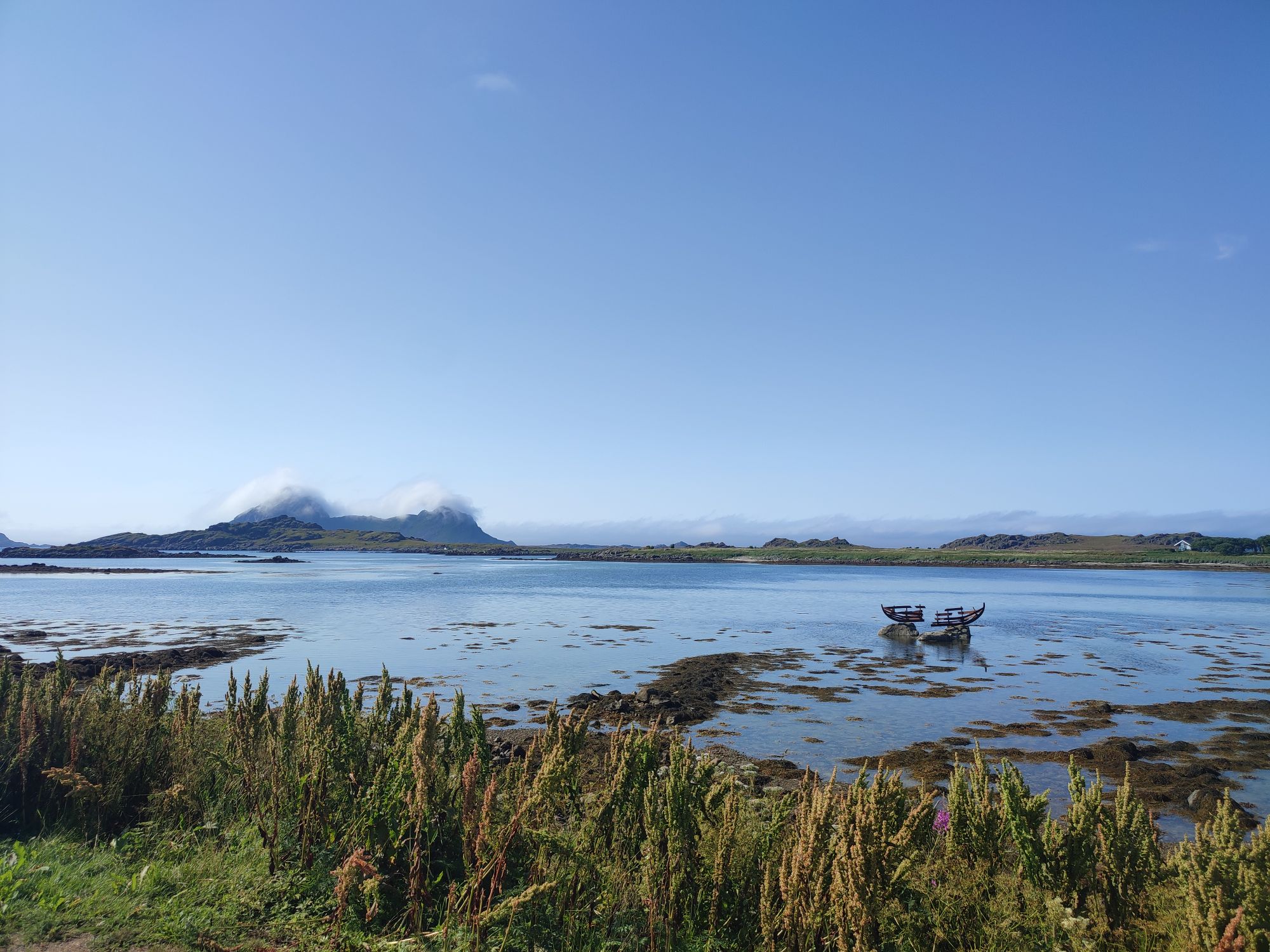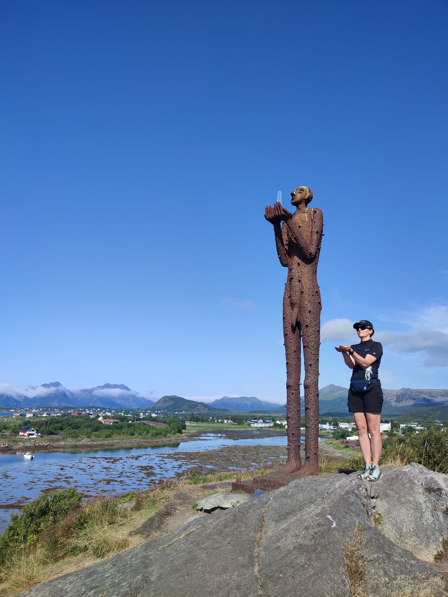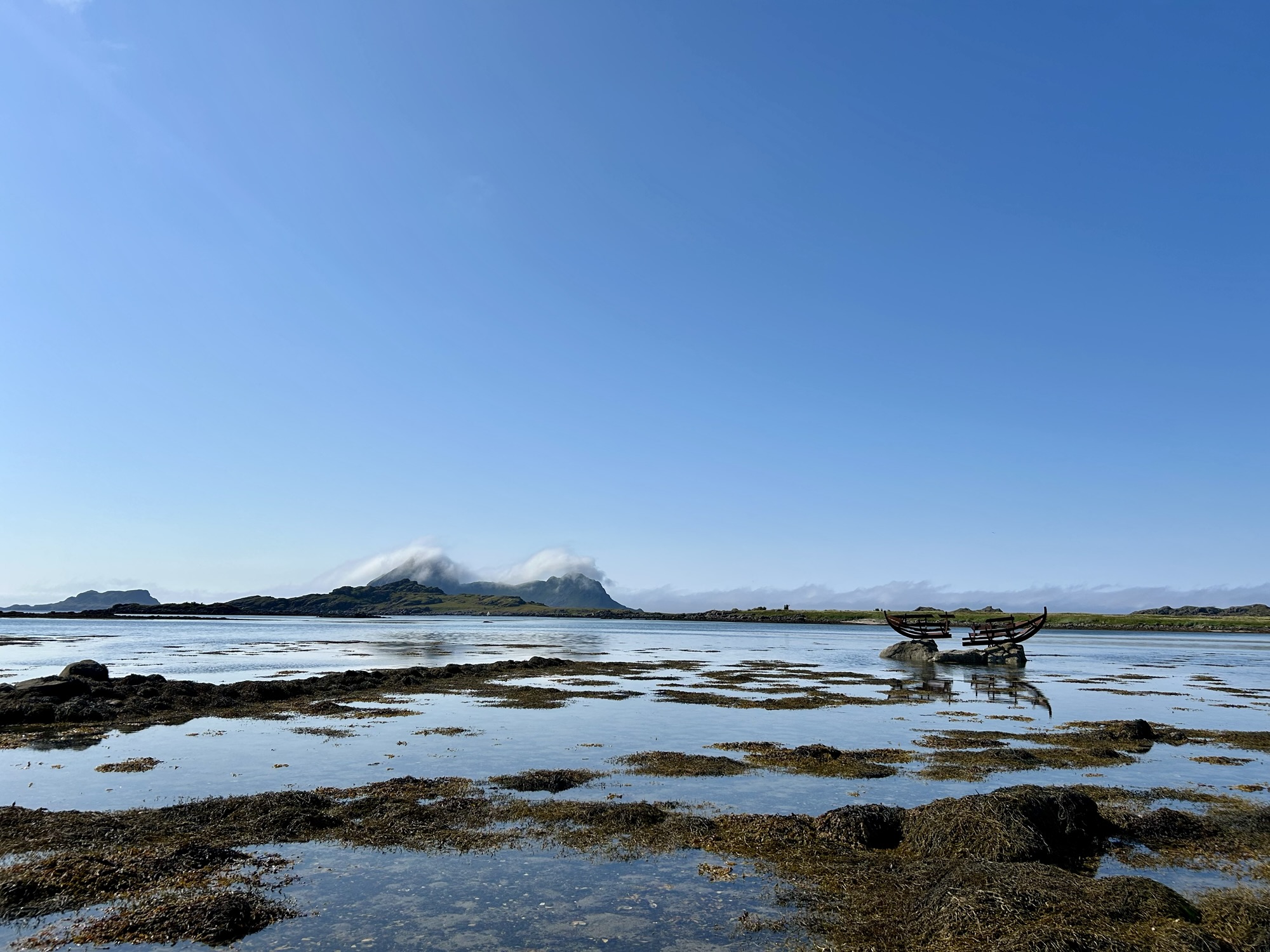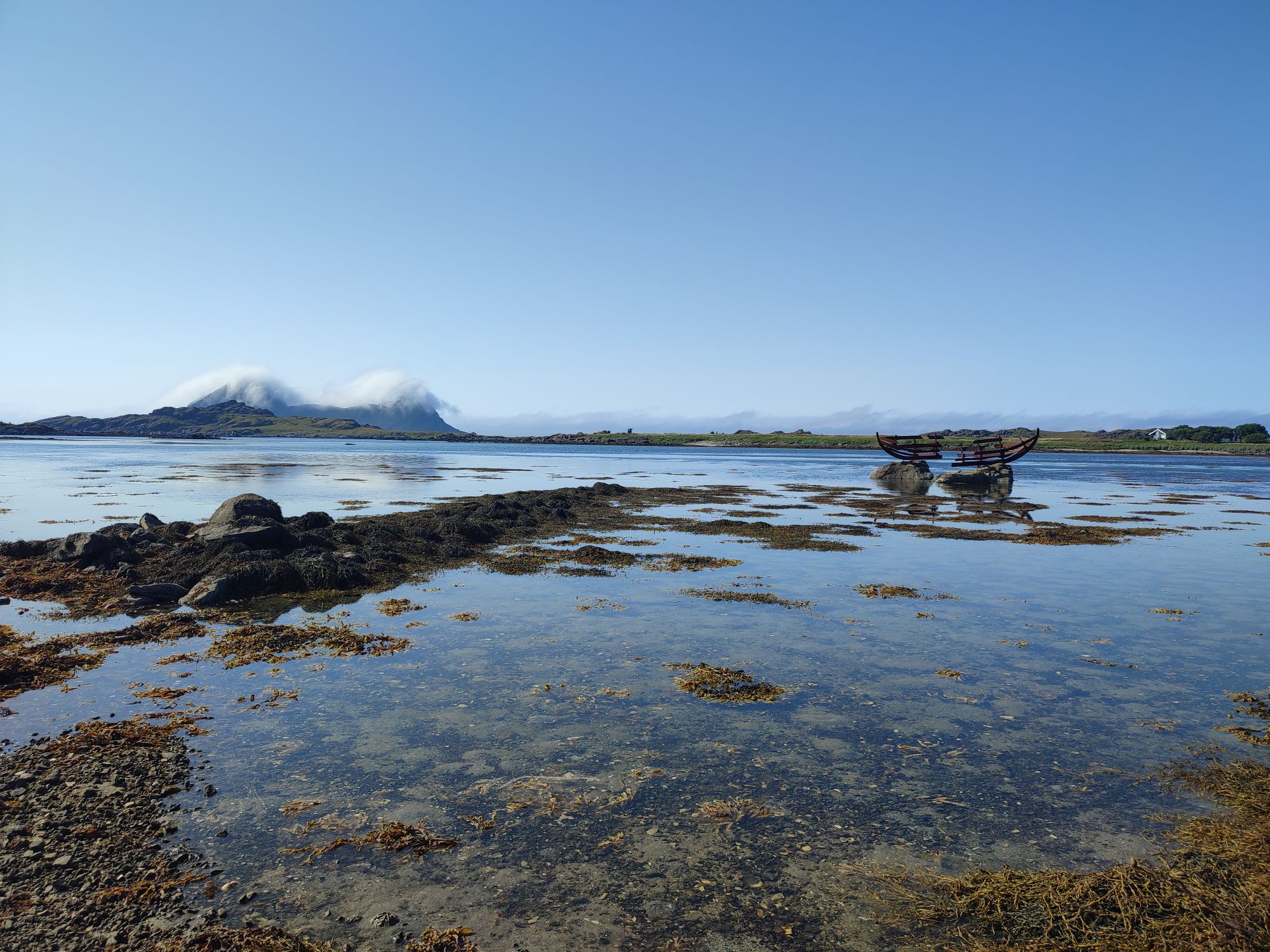 Nous continuons notre route et croisons ce bonhomme en fer perché (Man from the Sea) qui domine la baie de Bø. Une autre scultpure en forme de bateau a été disposée dans la baie. Une cabane en bois fait office de musée des barques d’autrefois. Cette vue sur la baie nous a vraiment charmées. Nous aurions pu rester des heures à admirer le paysage.