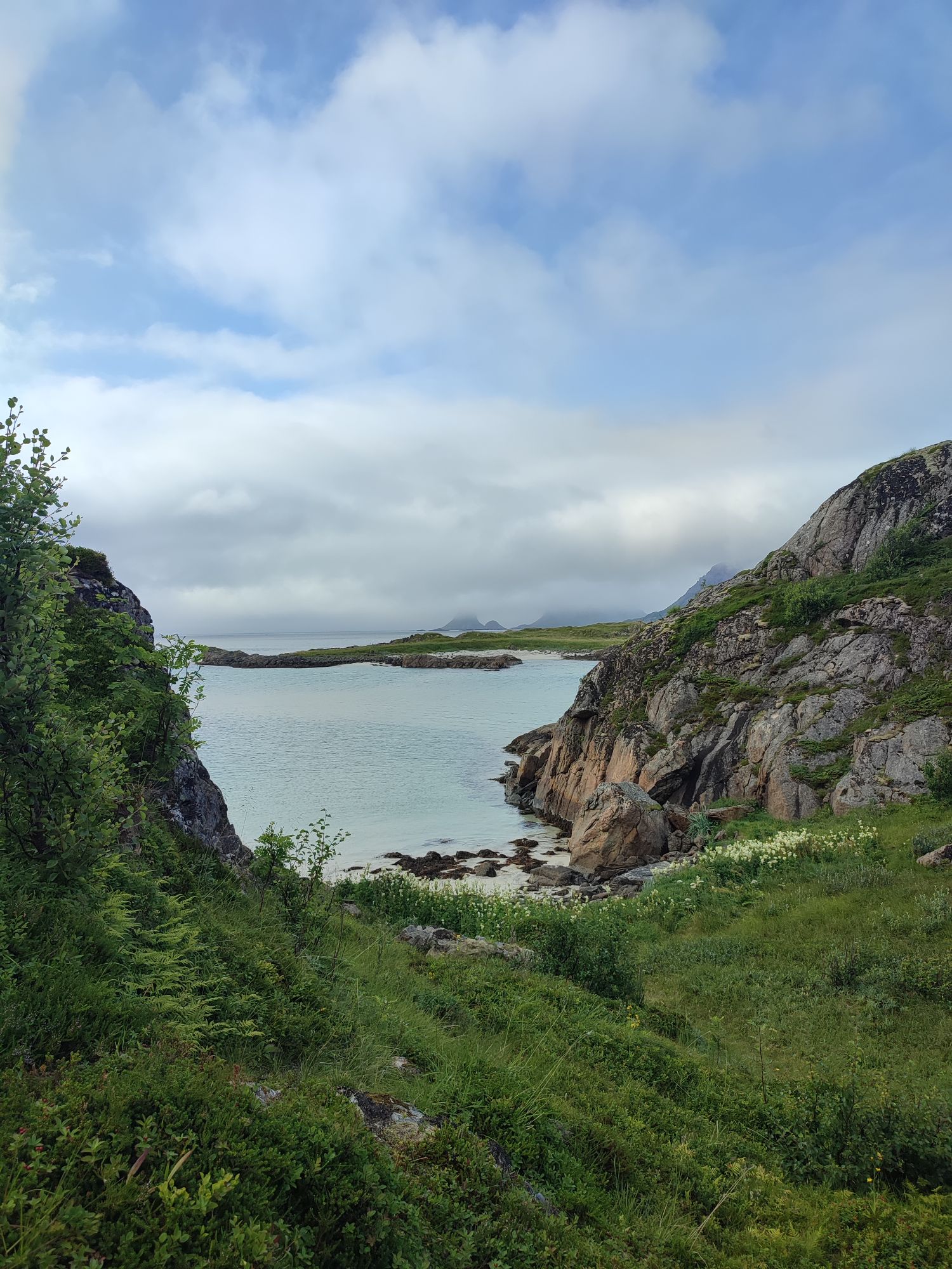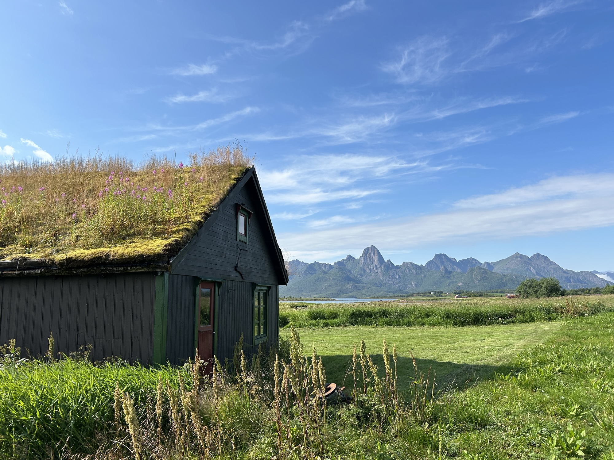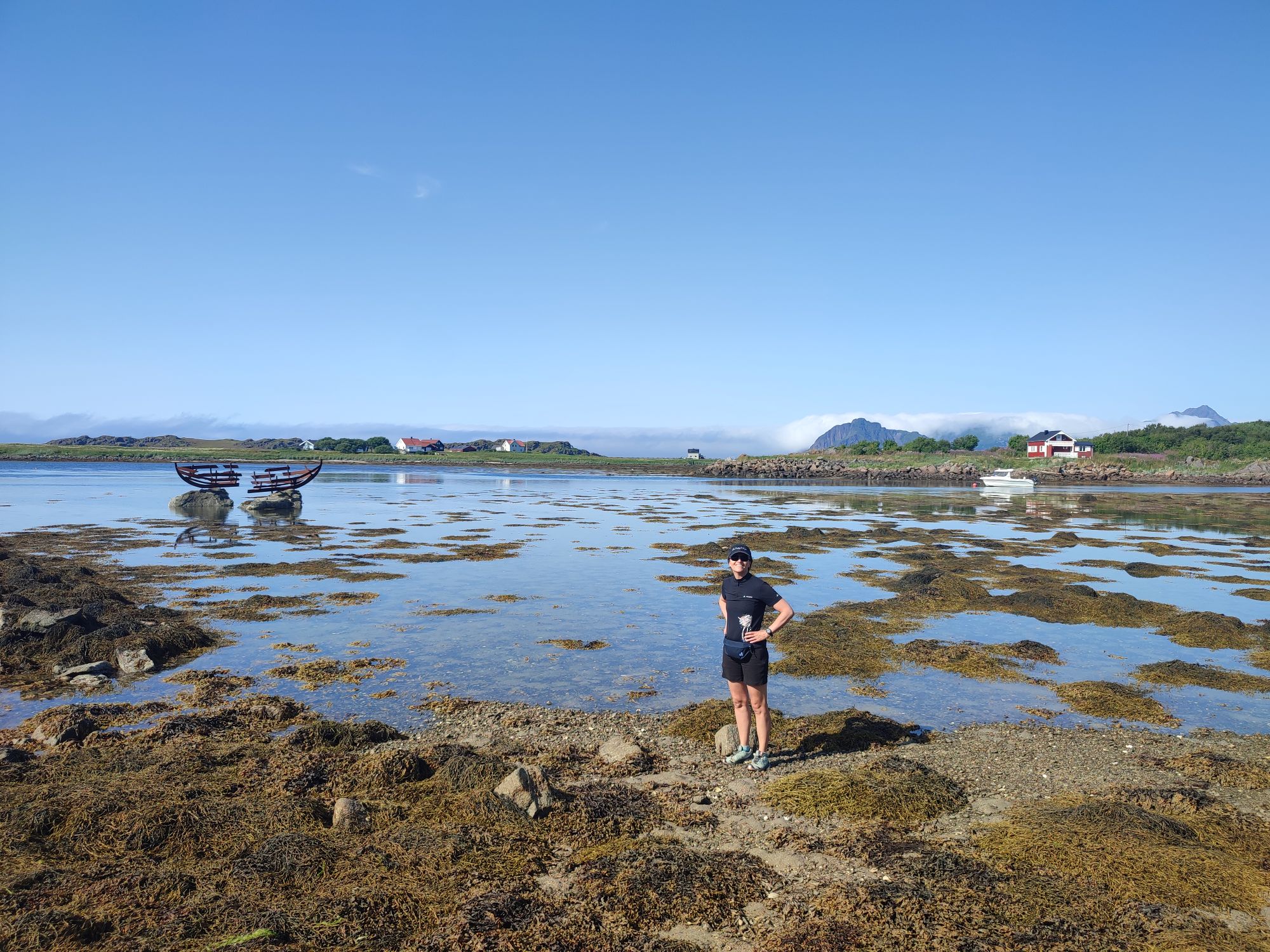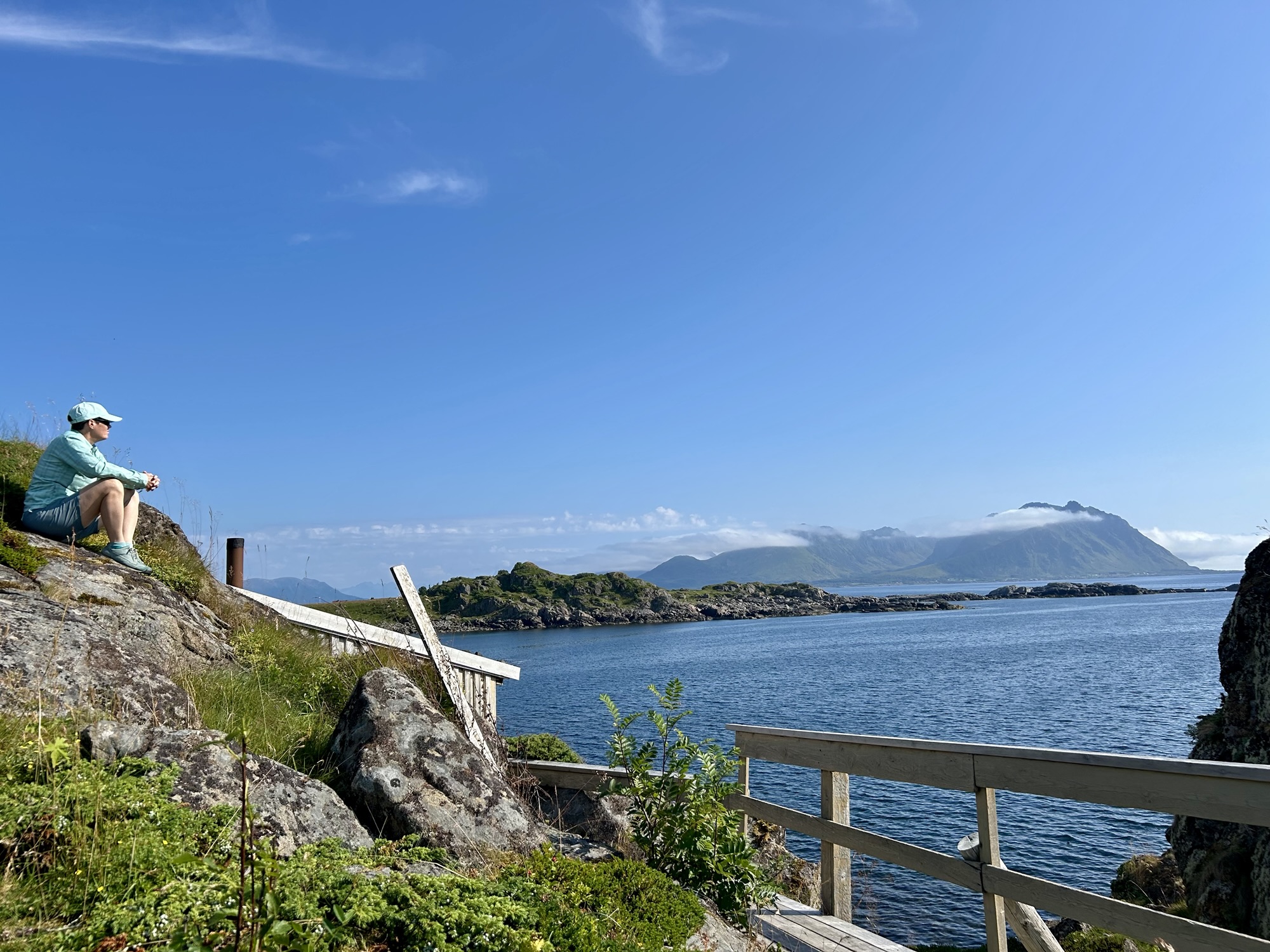 Nous continuons notre route et croisons ce bonhomme en fer perché (Man from the Sea) qui domine la baie de Bø. Une autre scultpure en forme de bateau a été disposée dans la baie. Une cabane en bois fait office de musée des barques d’autrefois. Cette vue sur la baie nous a vraiment charmées. Nous aurions pu rester des heures à admirer le paysage.