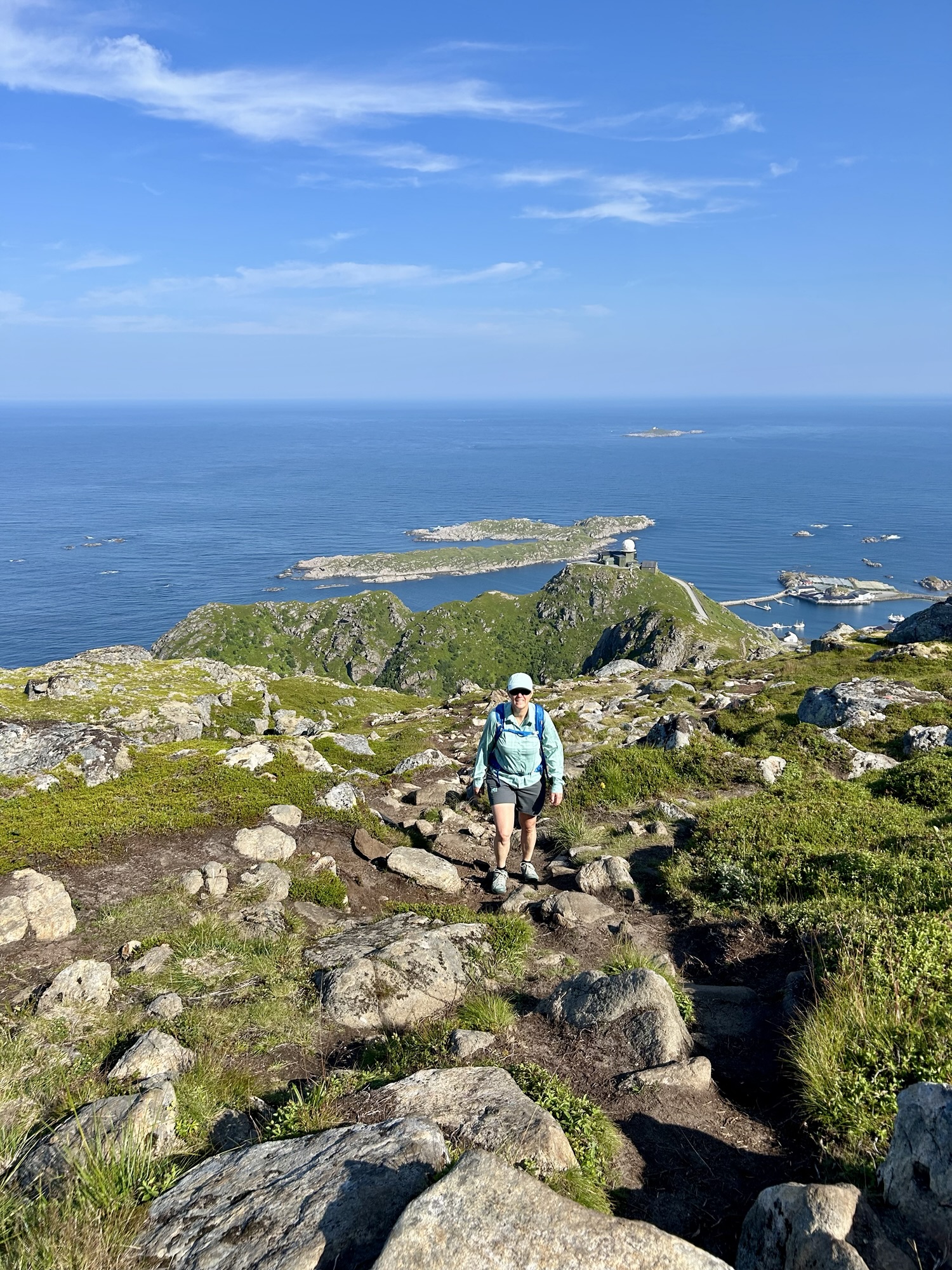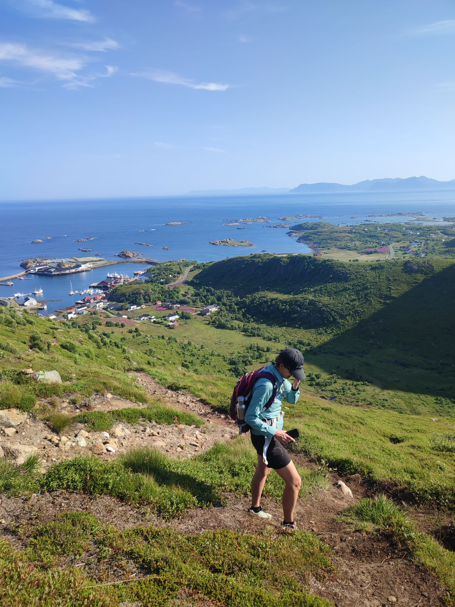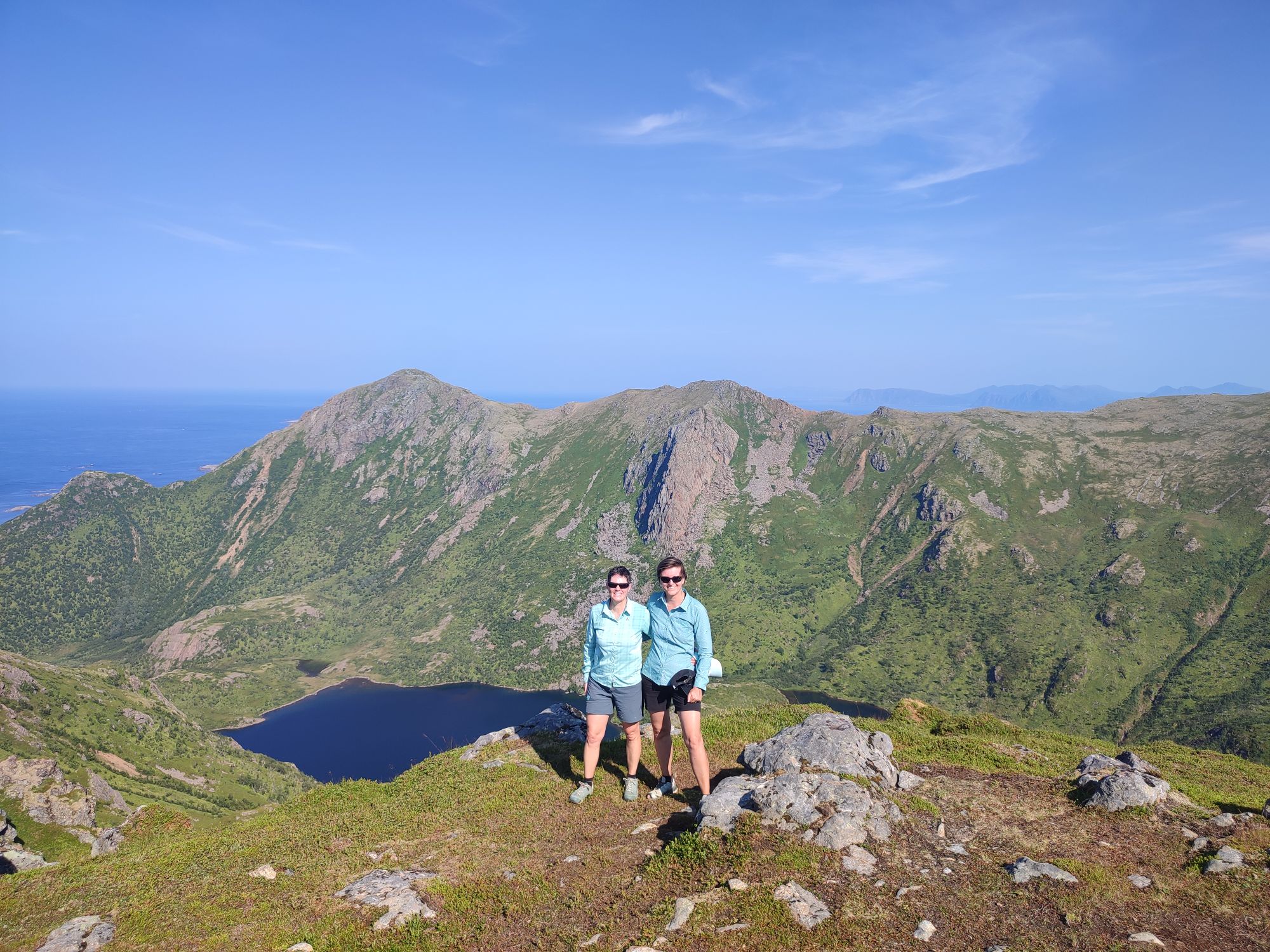 Aujourd’hui, debout de bonne heure, nous partons pour la randonnée de la Reine (Dronningruta), un parcours d’un peu plus de 12km. Celle-ci débute tout au nord de l’île de Langoya à Stø à 1h de route de notre logement. A 10h, nous entamons doucement la montée (400m de dénivelé positif sur 2km pour commencer…). Les paysages sont magnifiques, le soleil est toujours au rendez-vous (il fait même bien chaud…), aussi nous en prenons plein les mirettes!