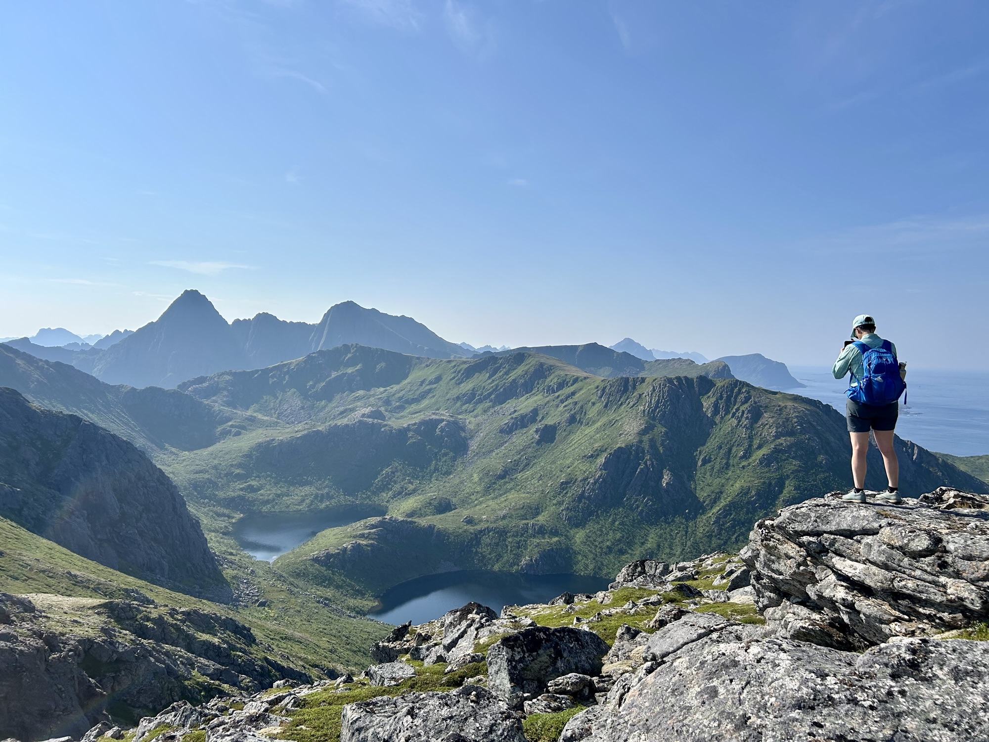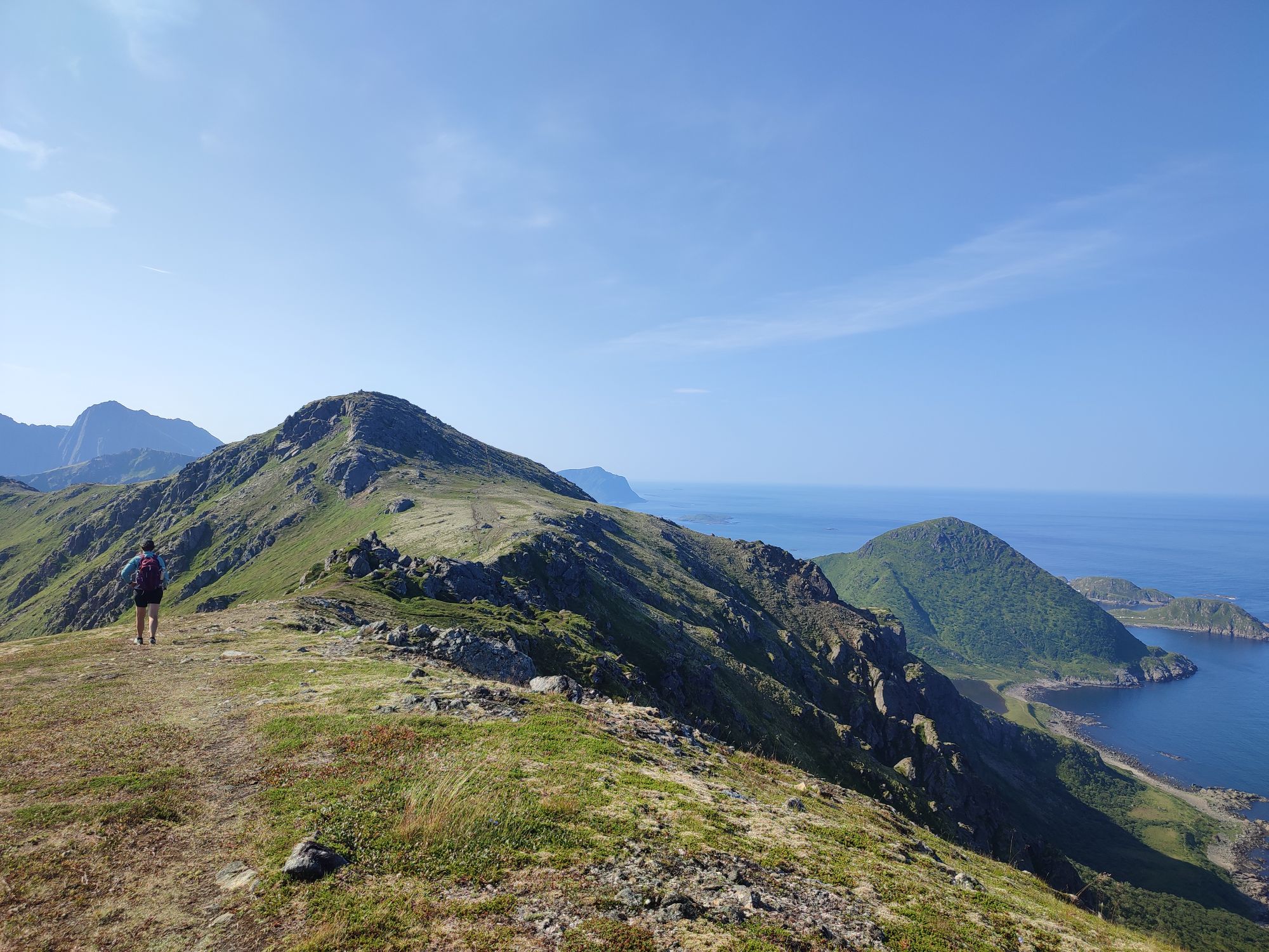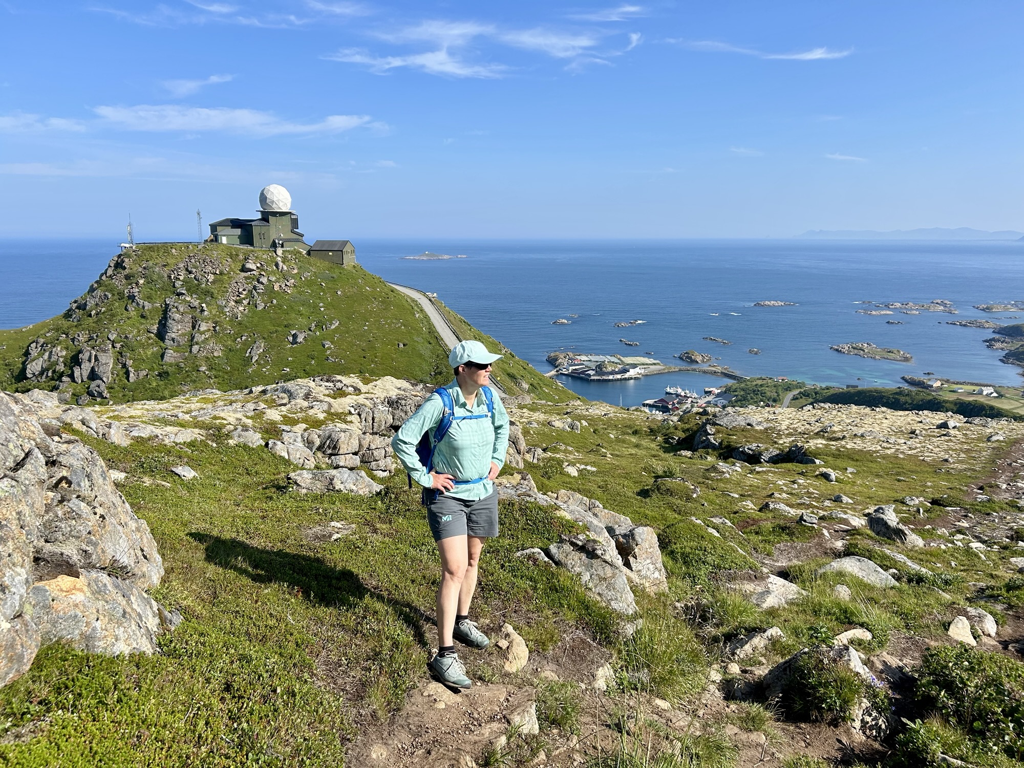 Aujourd’hui, debout de bonne heure, nous partons pour la randonnée de la Reine (Dronningruta), un parcours d’un peu plus de 12km. Celle-ci débute tout au nord de l’île de Langoya à Stø à 1h de route de notre logement. A 10h, nous entamons doucement la montée (400m de dénivelé positif sur 2km pour commencer…). Les paysages sont magnifiques, le soleil est toujours au rendez-vous (il fait même bien chaud…), aussi nous en prenons plein les mirettes!