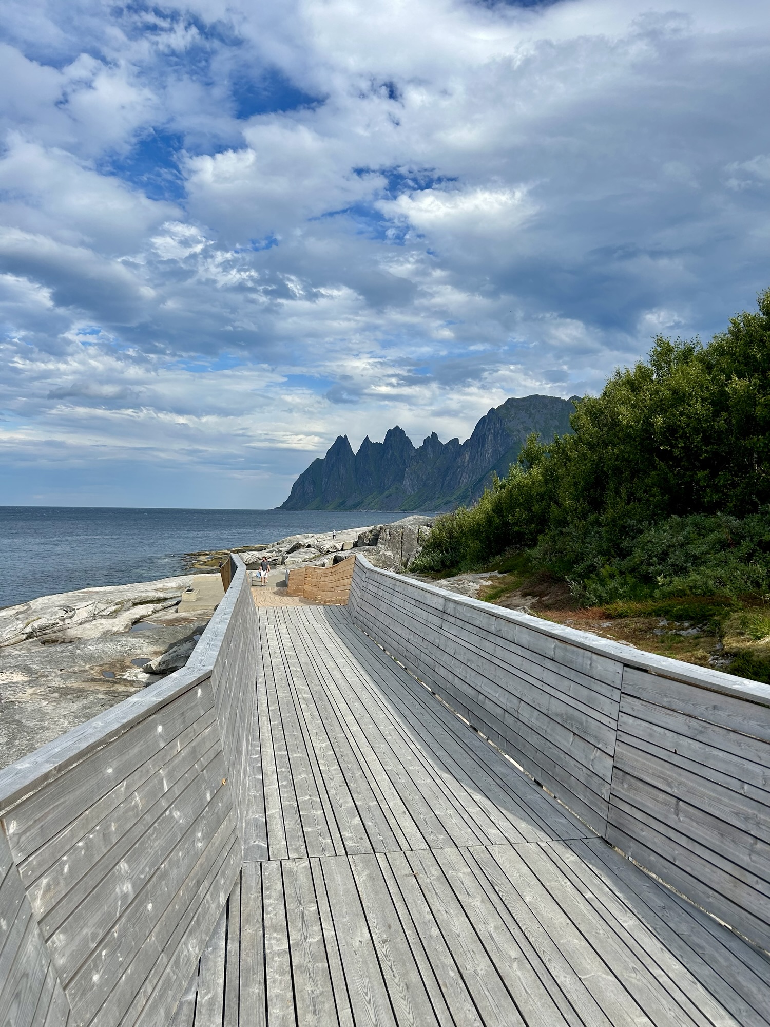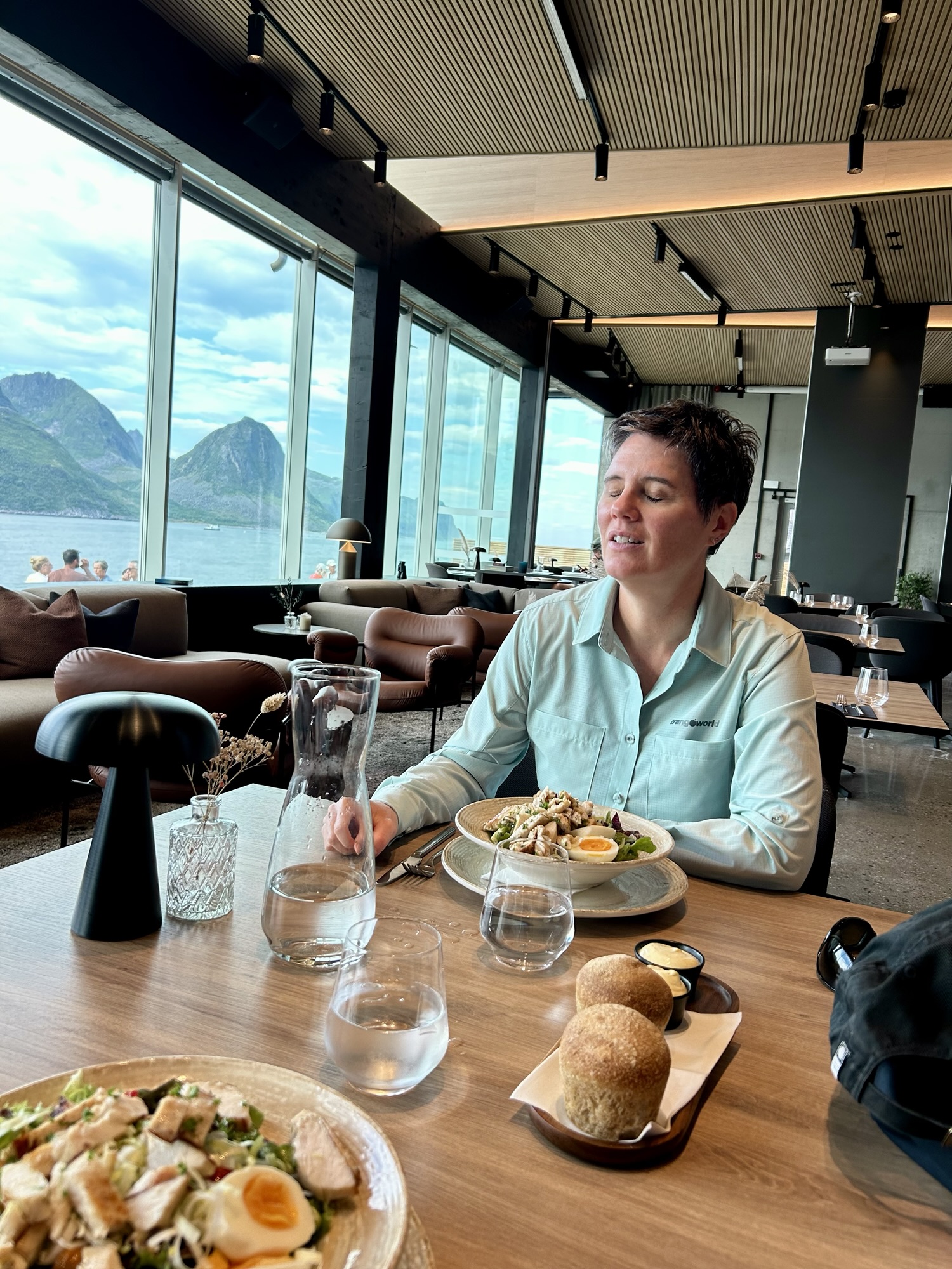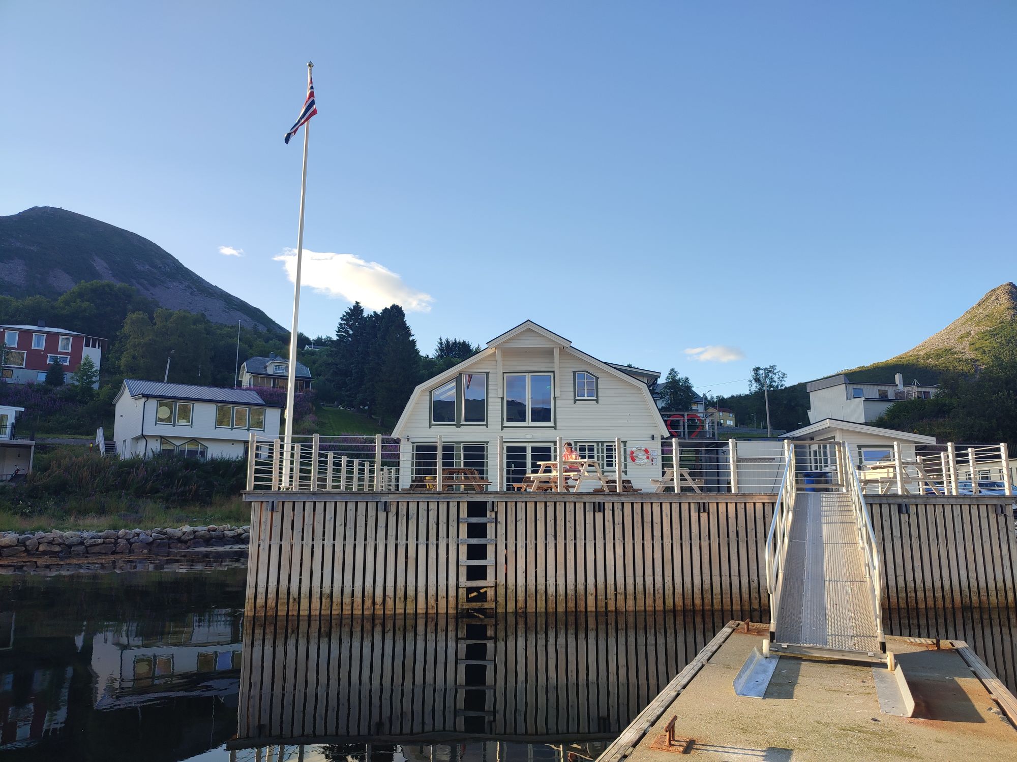 Nous faisons de nombreux arrêts photos / balade dont : une passerelle avec une vue fantastique puis Tungeneset qui offre une très belle vue sur les « dents du diable », et finalement Husoy, magnifique presqu’île au bout du bout de l’île ! C’est ici que nous déjeunons, dans un restaurant avec une superbe vue sur le fjord. Le temps s’est un peu couvert, il fait gris et le vent souffle fort !